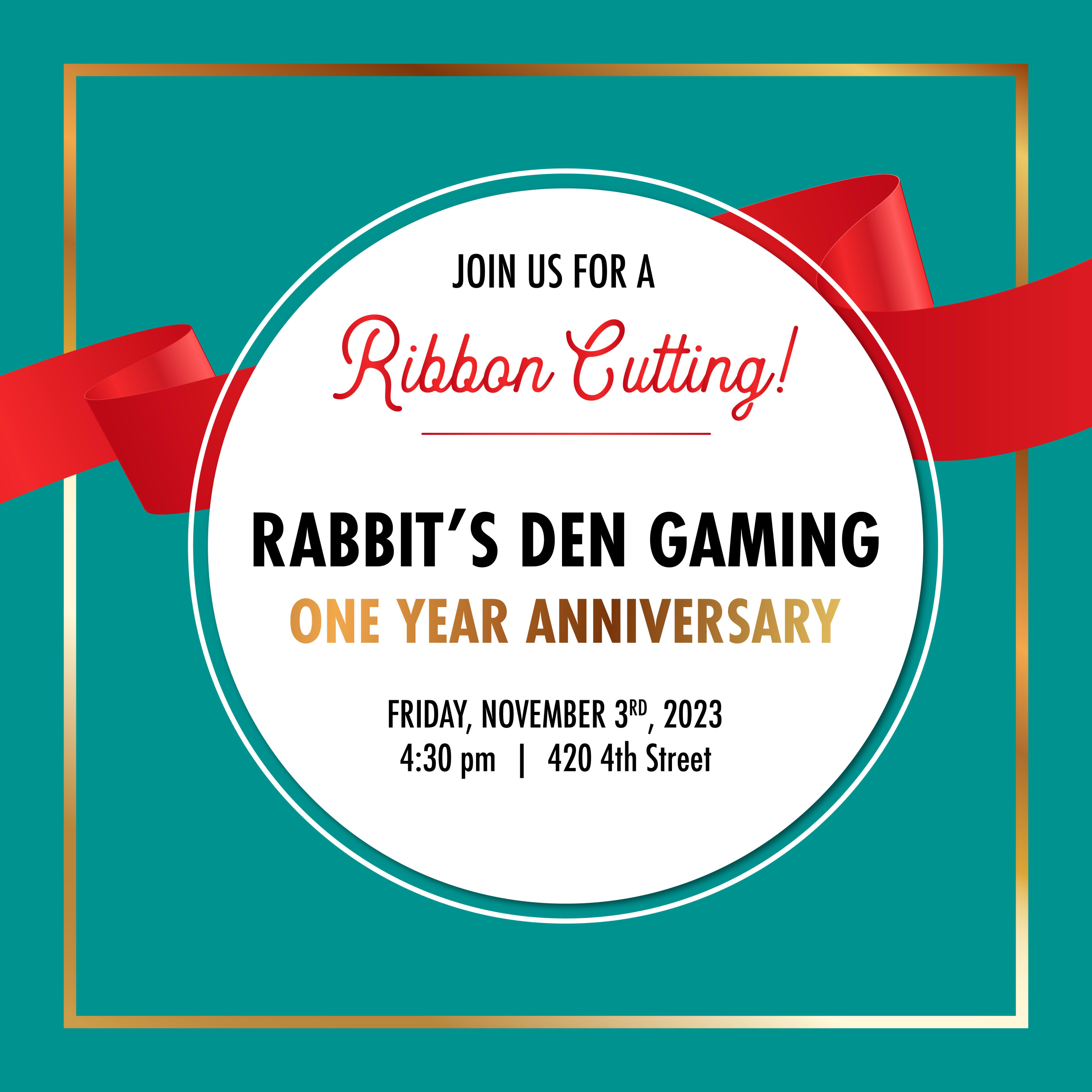 You're invited to celebrate the one year anniversary of Rabbit's Den Gaming! Please join us for warm apple cider, cookies, and a ribbon cutting at 4:30pm